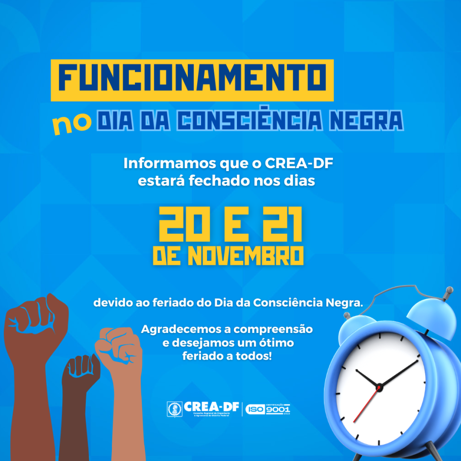 ⚠️Atenção ao expediente do CREA-DF no feriado do Dia da Consciência Negra.